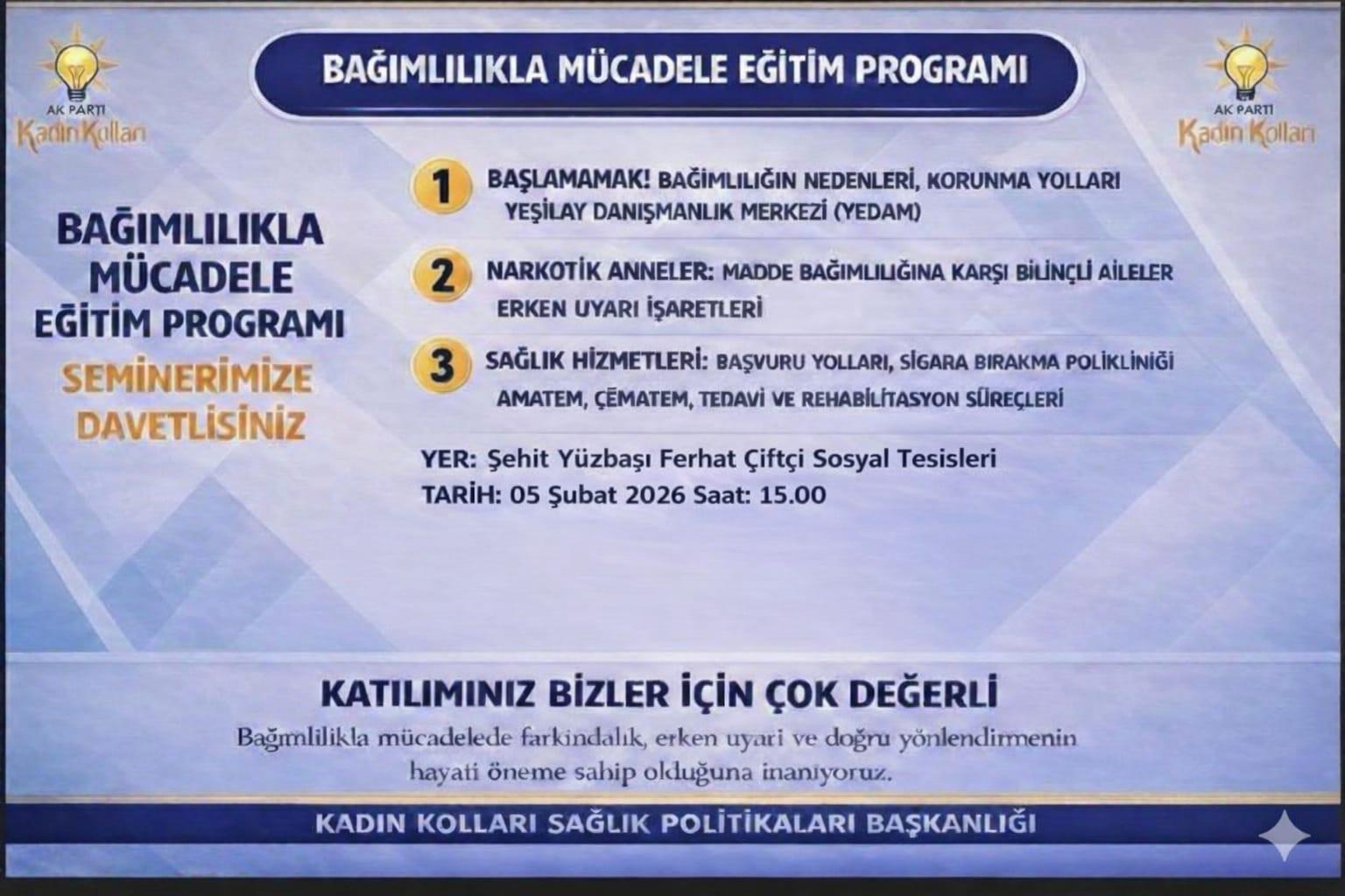 Bağımlılıkla Mücadele Eğitim Programı Yer: Şehit Yüzbaşı Ferhat Çiftçi Sosyal Tesisleri Tarih: 5 Şubat Perşembe (Bugün) Saat: 15.00 Toplum sağlığını güçlendirmeye yönelik bu eğitim programına tüm ilgililer davetlidir.
