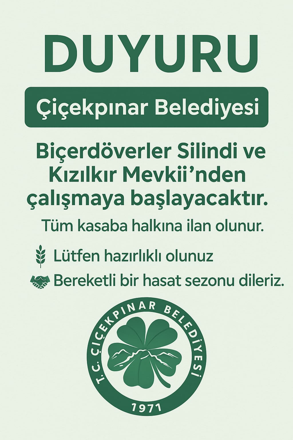 Biçerdöverler silindi ve Kızılkır Mevkii'nden çalışmaya başlayacaktır. Tüm kasaba halkına ilan olunur. Bereketli bir hasat sezonu dileriz.