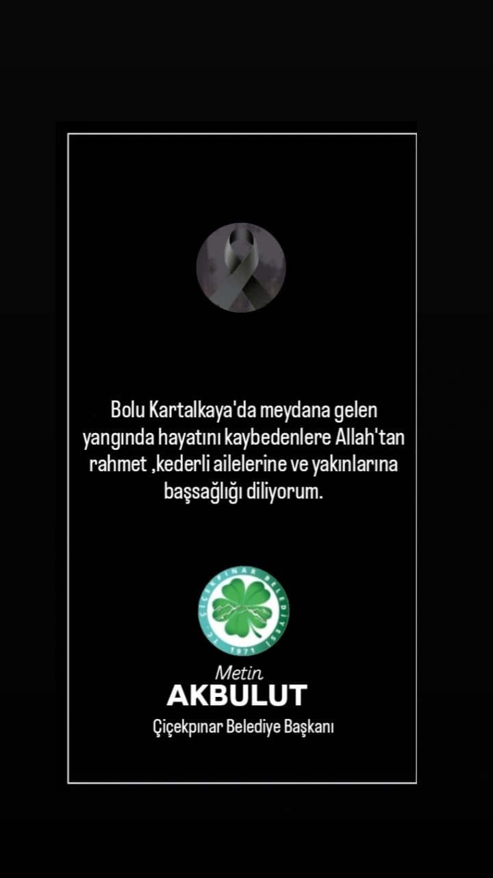"Bolu Kartalkaya'da bir otelde meydana gelen yangında hayatını kaybeden vatandaşlarımıza Allah'tan rahmet niyaz ediyor, yaralılarımıza acil şifalar diliyorum.
